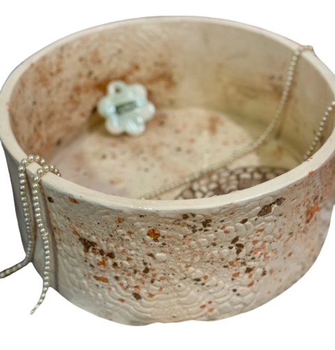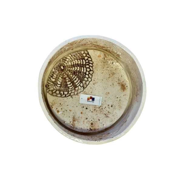 Color crudo , con detalles simil terrazo en engobe y bajorelieve en ceramica artesanal con tapa doble fondo que oculta el drenaje.